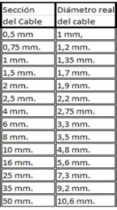 Con esta tabla ya podemos saber cuantos milímetros reales mide un cable eléctrico sabiendo la sección, o al contrario, sabiendo la medida de un cable en milímetros, con la tabla, podemos saber la sección.