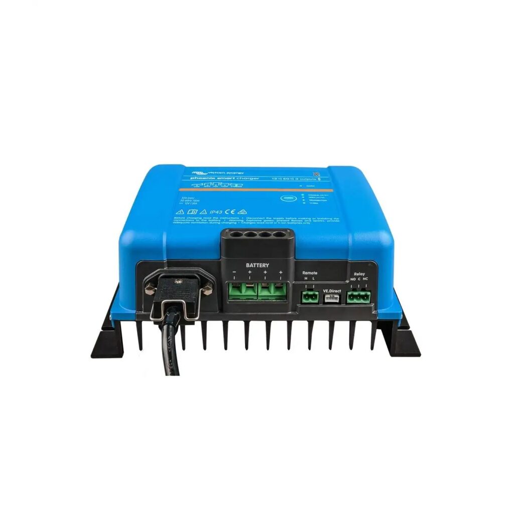 El Cargador Centaur 12/50 (3) es un cargador de baterías de 12V que ofrece una corriente de carga de 50 amperios y cuenta con tres salidas independientes. Esto permite cargar simultáneamente hasta tres bancos de baterías, siendo ideal para embarcaciones, vehículos recreativos y sistemas de energía solar o fuera de la red.