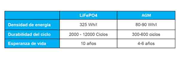 A tabela seguinte apresenta algumas caraterísticas-chave de desempenho das baterias de lítio versus baterias de chumbo-ácido (AGM):