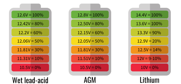 Os voltímetros são dispositivos simples que apresentam apenas algumas informações, no entanto, esta leitura da tensão pode ser utilizada com bons resultados, uma vez que lhe pode dar uma percentagem aproximada do estado de carga da sua bateria, para lhe dar uma ideia aproximada da energia que lhe resta. Os diagramas abaixo mostram como a tensão da bateria corresponde a uma % do estado de carga para diferentes químicas de bateria.