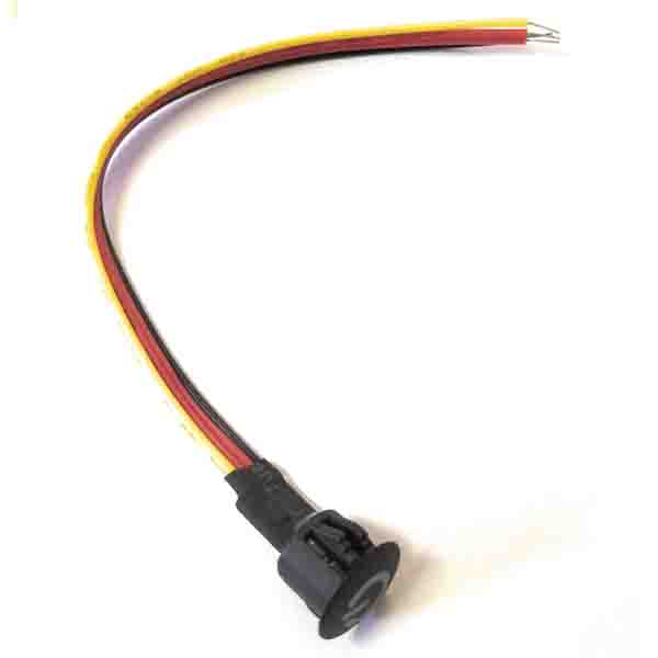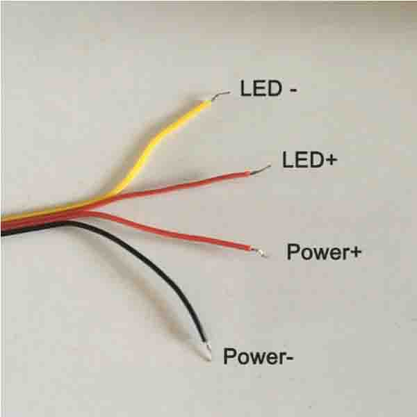 Fio vermelho para entrada de alimentação positiva, fio preto para entrada negativa (bateria); fio vermelho ligado ao LED positivo, fio amarelo ligado ao LED negativo.