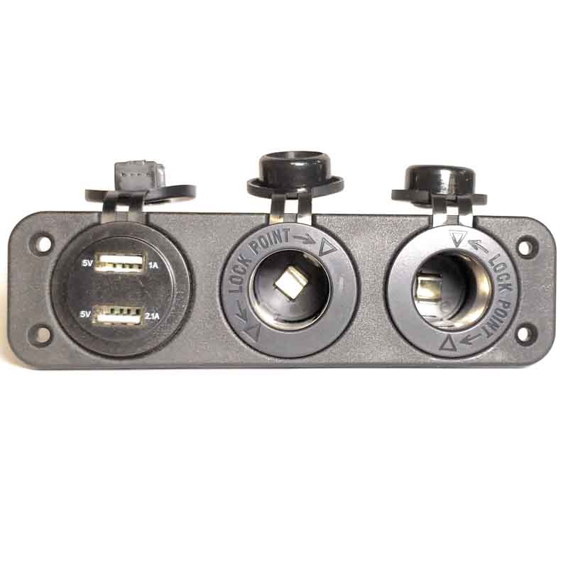 O painel inclui um voltímetro de 12 V com carregador USB duplo de 3,1 A e duas tomadas de carga de 12 V.